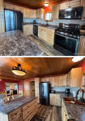 Another kitchen remodel. New cabinets, countertops, floor, appliances, wood on ceiling and faux finish on walls.